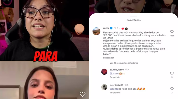 Lejos de permitir el disenso o de leer la crítica como parte del diálogo que la música y el arte en general habilitan, Cazzu eligió responder desde la bronca. En lugar de debatir con argumentos o abrir un espacio de intercambio, pareció incomodada por el solo hecho de que alguien opinara diferente. “Pero escuchá otra música, amor. Hay alrededor de 120 mil canciones nuevas todos los días y no son todas de Emilia”, fue su primer mensaje.