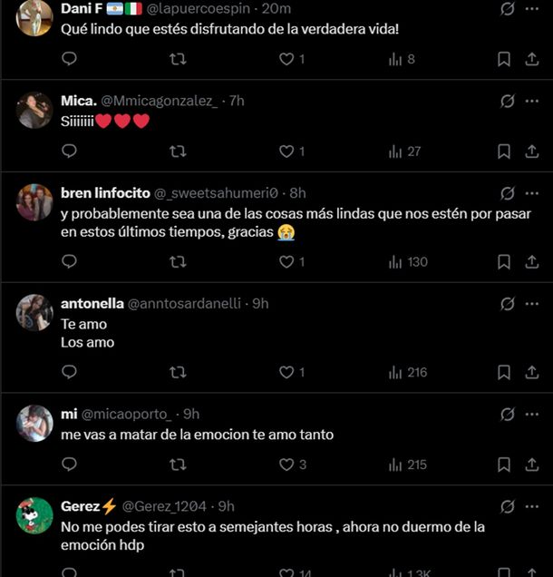 Algunos de los mensajes fueron: "Me llenas el alma, esta es la noticia más linda de los últimos tiempos... pasando una situación familiar muy dificil, me haces sonreir aún cuando estoy desbordada de tristeza", "me levante viendo esto y me hiciste el día entero".