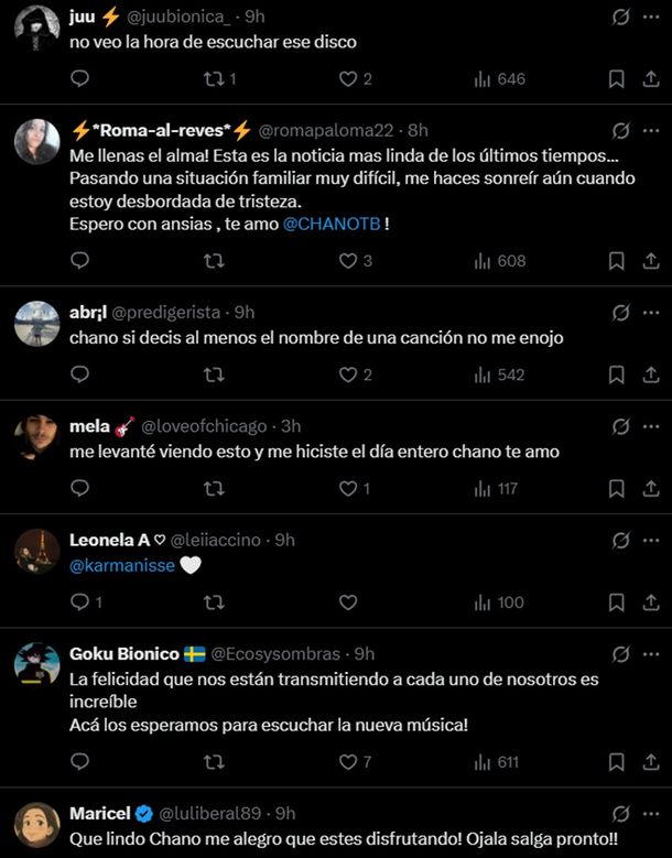 A su vez, le pidieron adelantos, "Chano si decis al menos el nombre de una canción no me enojo", expresó una usuaria, y todo indicaría que próximamente por esa misma red daría a conocer lo que se viene, mientras tanto sus fans deberan armarse de paciencia y esperar.