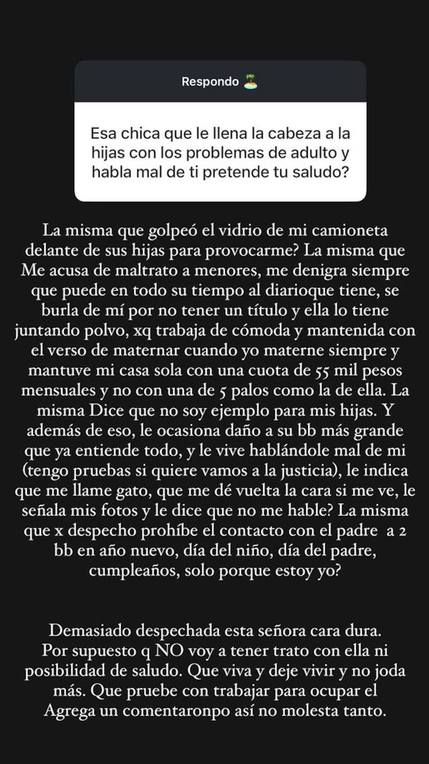 “¿La misma que golpeó el vidrio de mi camioneta delante de sus hijas para provocarme? ¿La misma que me acusa de maltrato a menores, me denigra cada vez que puede, se burla de mí porque no tengo un título y el de ella lo tiene juntando polvo? Porque trabaja de cómoda y mantenida con el verso de maternar, mientras yo me ocupé de mi casa sola con una cuota de 55 mil pesos y no con una de cinco palos como la de ella”, disparó con contundencia.
