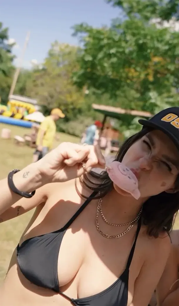 En esta ocasión especial, la modelo eligió un estilo único al combinar un pequeño top de bikini con unos jeans de cintura baja, destacándose por su elección de outfit. Completando su look con una gorra, agregó un toque casual al conjunto, mientras que su maquillaje se caracterizó por el uso de brillos y glitter, acorde al ambiente festivo del evento.