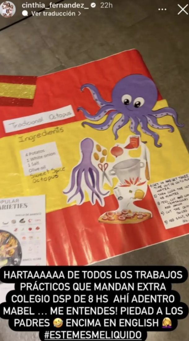 En la foto que compartió, Cinthia muestra la cartulina que estaba ayudando a terminar a altas horas de la noche. “Piedad a los padres. Encima en english. Este mes me liquidó”, escribió la bailarina muy enojada. Rápidamente, sus seguidores la ayudaron con la traducción para que pudiera terminarla más rápido. Más tarde, mostró el resultado final y agradeció a quienes le dieron una mano: “Correcciones listas”.