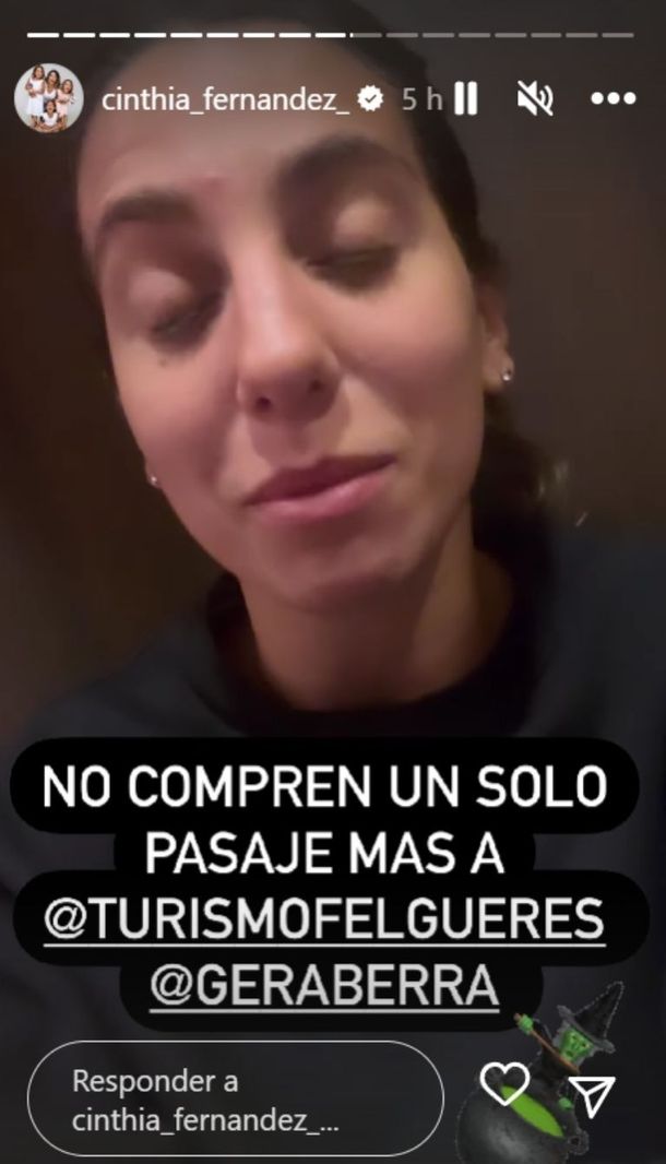 “Me enteré por las noticias de que la empresa con la que yo trabajé, y a la cual le compré pasajes como los de Punta Cana, estafó a miles de personas y las dejaron varadas”, dijo Cinthia en sus historias. “Gerardo, su dueño, está prófugo”, expresó con total furia por lo sucedido.