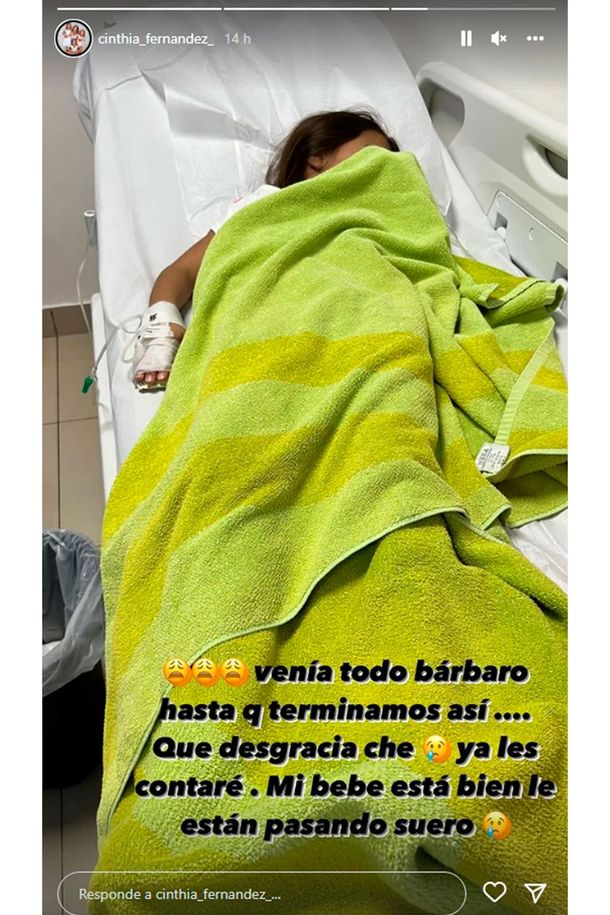 “Venía todo bárbaro hasta que terminaron así… ¡Qué desgracia, che! Ya les contaré”, escribió la bailarina en sus historias, donde muestra a Francesca con un catéter recibiendo suero y con una toalla. “Mi bebé está bien, le están pasando suero”, agregó Cinthia Fernández.