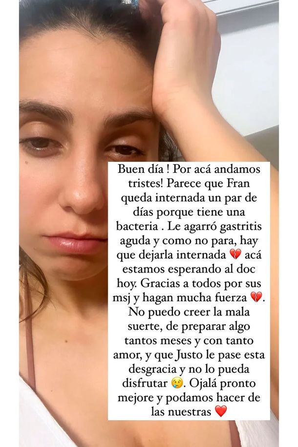 Este lunes, Cinthia volvió a usar sus redes para explicar: “Buen día, por acá andamos tristes, parece que Fran queda internada por una bacteria. Le agarró gastritis aguda y como no para, hay que dejarla internada. Estamos esperando al doc”.