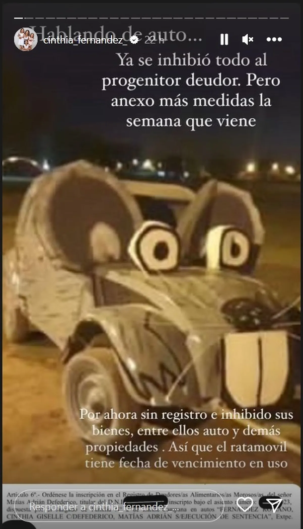 Y ahí agregó en otra historia: "Hablando de auto... Ya se inhibió todo al progenitor deudor. Pero anexo más medidas la semana que viene". "Por ahora sin registro e inhibido sus bienes, entre ellos auto y demás propiedades. Así que el ratamóvil tiene fecha de vencimiento en uso", finalizó muy picante.