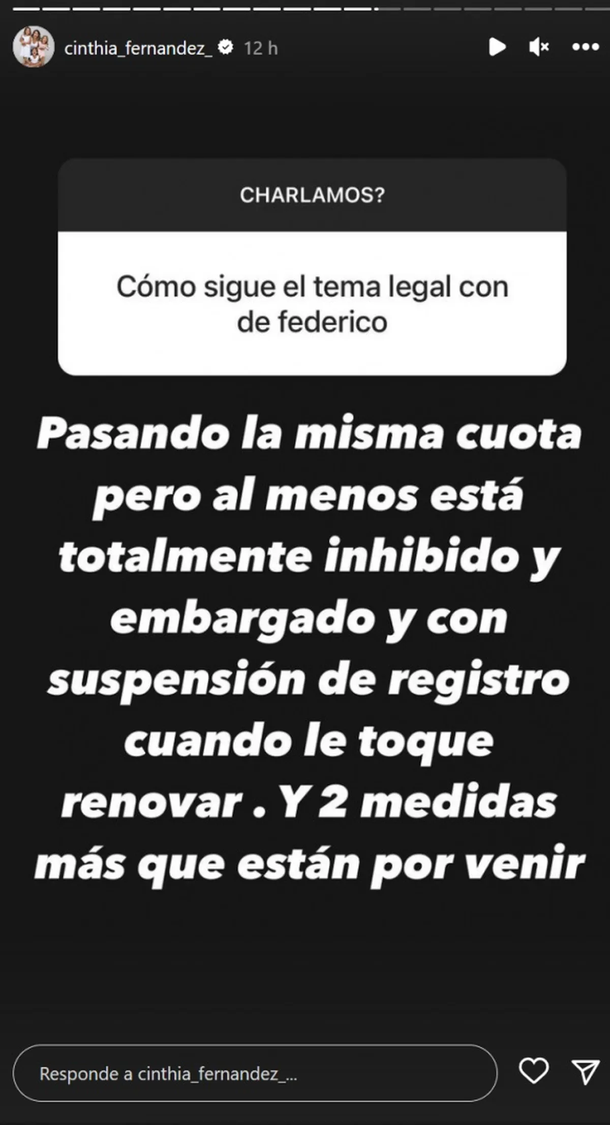 "¿Cómo sigue el tema legal con Defederico?", le preguntaron a Cinthia desde las consultas de Instagram, y ella fue durísima en su respuesta, adelantando que la próxima semana comenzará una nueva acción legal.