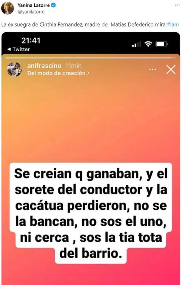 Claro que junto al comentario tuitero, Latorre compartió el irónico estado de la ex suegra de Cinthia Fernández, que decía "Se creían que ganaban y el sorete del conductor y la cacatúa perdieron. No se la bancan, no sos el uno ni cerca. Sos la tía Tota del barrio”.
