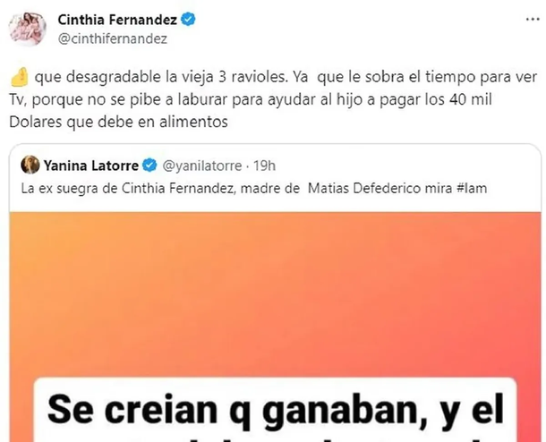 El lunes por la noche Yanina Latorre expuso en Twitter a Analía Frascino tras burlarse de ella y de Ángel de Brito al perder sus respectivas ternas en los Martín Fierro. “La exsuegra de Cinthia Fernández, madre de Matías Defederico, mira LAM”, deslizó despreocupada la angelita.