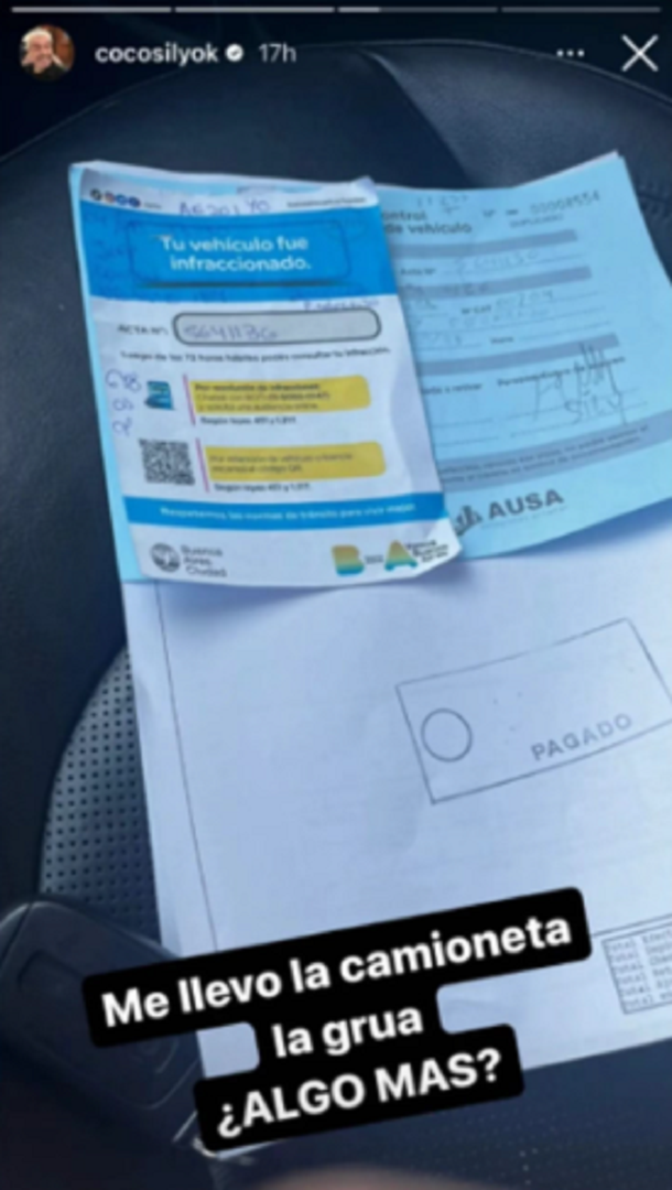 Coco le pone garra al temporal y compartió con sus seguidores un nuevo problema que no vio venir. Fue a buscar su camioneta y en su lugar encontró un papel emitido por el Gobierno de la Ciudad Buenos Aires, para notificarle que su vehículo fue infraccionado. “Me llevó la camioneta la grúa. ¿Algo más?”, dijo tratando de tomárselo con humor.
