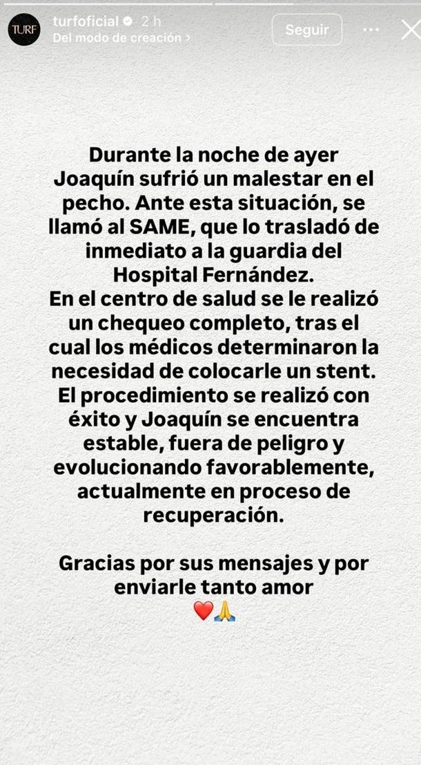 Comunicado de Turf por la salud de Joaquín Levinton: le pusieron un stent y se encuentra "estable"