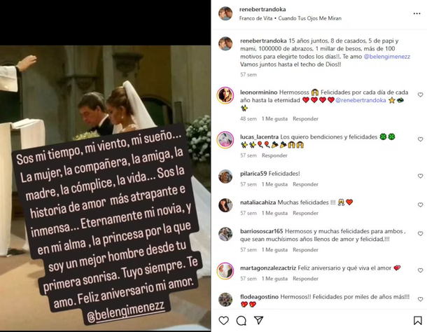 En sus redes sociales, Bertrand compartía de forma frecuente mensajes llenos de amor hacia su esposa, dejando entrever el fuerte vínculo que los unía. Uno de los últimos posteos que publicó fue el 20 de octubre del año pasado, con motivo del Día de la Madre. “Amiga, compañera, confidente, consejera... El rayo de Sol que ilumina mis días... Hermosa mamá... Desde hace 16 años la vida es siempre a tu lado”, escribió junto a una serie de fotos familiares. En ese mensaje también agradeció a Belén por hacerlo padre y expresó: “Que Dios acompañe siempre tus sueños. Te amo, princesa”.