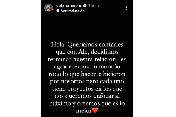 La historia publicada por la joven en este miércoles dice lo siguiente: "¡Hola! Queríamos contarles que con Ale decidimos terminar nuestra relación. Les agradecemos un montón todo lo que hacen e hicieron por nosotros, pero cada uno tiene proyectos en los que nos tenemos que enfocar al máximo y creemos que es lo mejor".