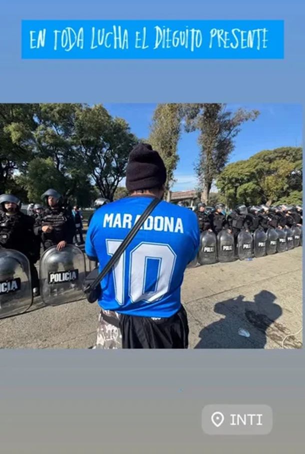 El respaldo de la hija del Diez, llegó a través de sus historias de Instagram, donde compartió una foto de la protesta que tuvo lugar este lunes sobre la Avenida General Paz. En la imagen, se veía una bandera con el rostro de Diego Maradona junto a los manifestantes, y la frase: “En toda lucha, el Dieguito presente”. La publicación fue acompañada por la canción Para siempre, de los Ratones Paranoicos, sumando un tono emotivo al mensaje.