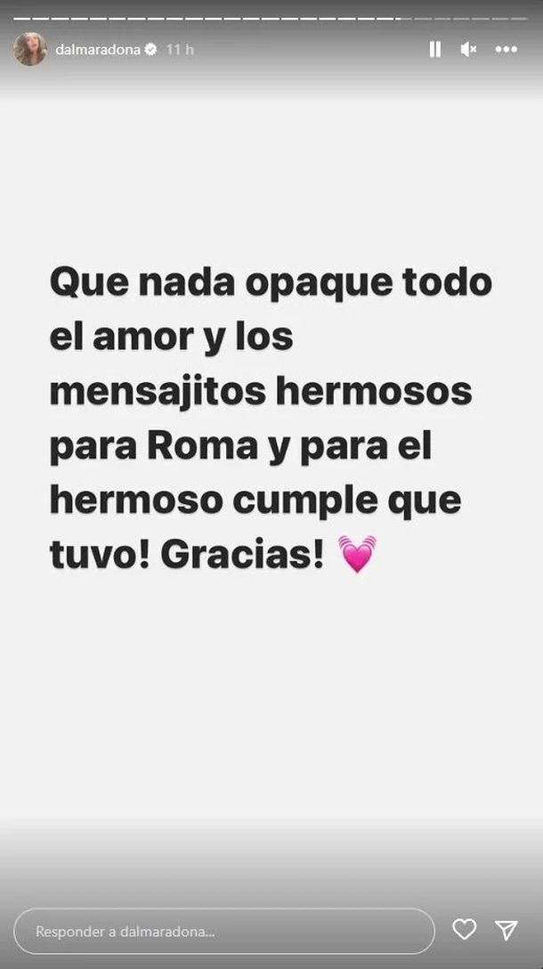 Para la tercer story, Dalma decidió bajar el tono y reconocer a las personas que le dedicaron buenos deseos por el cumple de la pequeña: "Que nada opaque todo el amor y los mensajitos hermosos para Roma y para el hermoso cumple que tuvo! Gracias!".