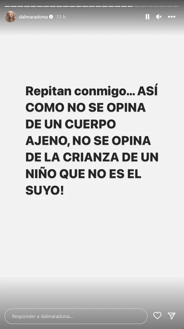 La hija de Claudia Villafañe siguió la serie de stories con una frase fuerte: "Repitan conmigo... ASÍ COMO NO SE OPINA DE UN CUERPO AJENO, NO SE OPINA DE LA CRIANZA DE UN NIÑO QUE NO ES EL SUYO!"