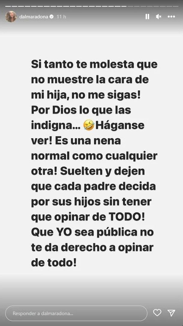 "Si tanto te molesta que no muestre la cara de mi hija, no me sigas! Por Dios, lo que las indigna... háganse ver! Es una nena normal como cualquier otra! Suelten y dejen que cada padre decida por sus hijos sin tener que opinar de TODO! Que YO sea pública no te da derecho a opinar de todo!" escribió en la primera story, muy afectada.