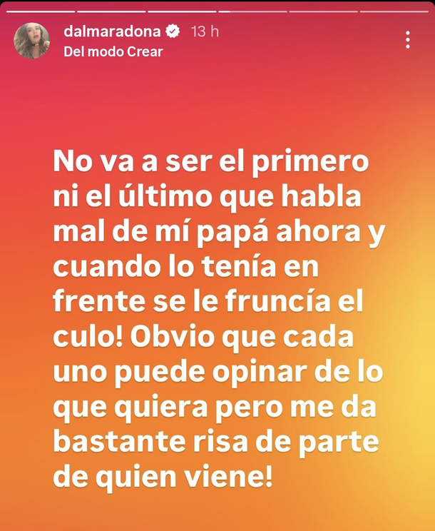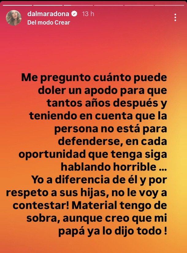 Las hijas del ídolo no tardaron en recoger el guante. La primera en reaccionar fue Dalma, quien cuestionó que Macri siga hablando del Diez cuando ya no puede defenderse. La actriz sostuvo que tiene “material de sobra” para responderle, pero aclaró que por respeto no lo hará. Además, agregó que le resulta llamativo que haya quienes critiquen ahora a su padre cuando no se animaban a decirle esas cosas en persona.