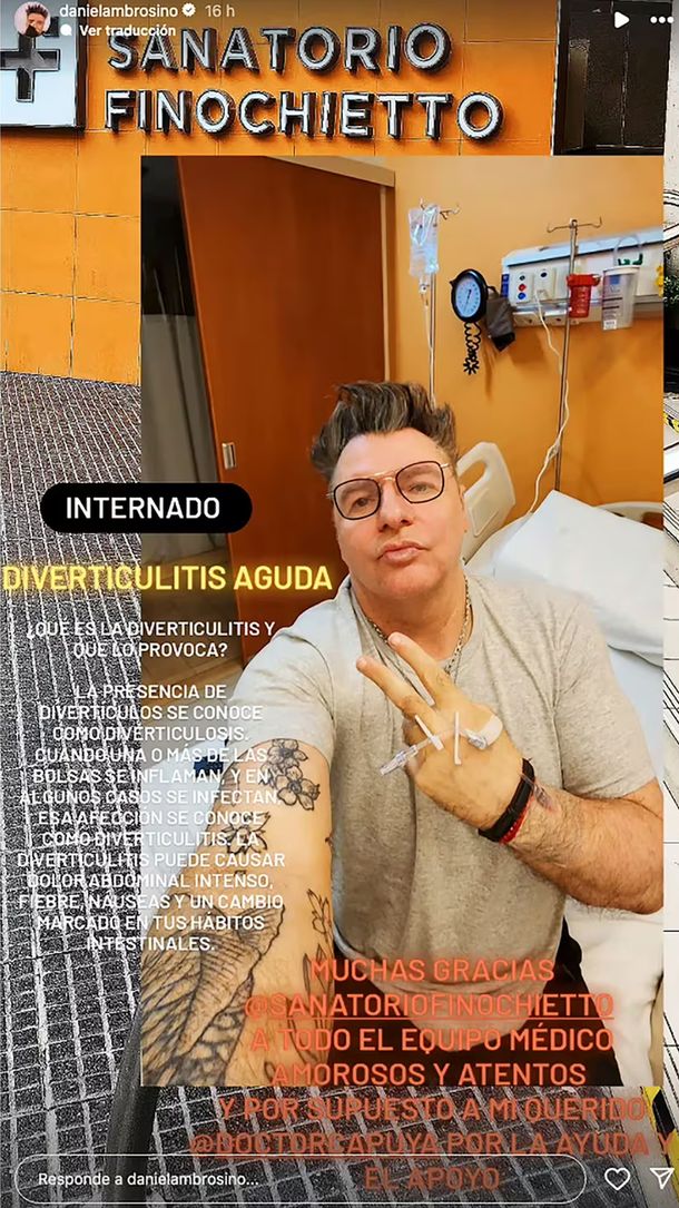 Daniel Ambrosino generó preocupación entre sus seguidores tras publicar una foto en el Sanatorio Finochietto, ubicado en la Ciudad de Buenos Aires. Juntamente con la imagen, el periodista contó que padece de diverticulitis aguda y que se encuentra internado desde hace unos días.