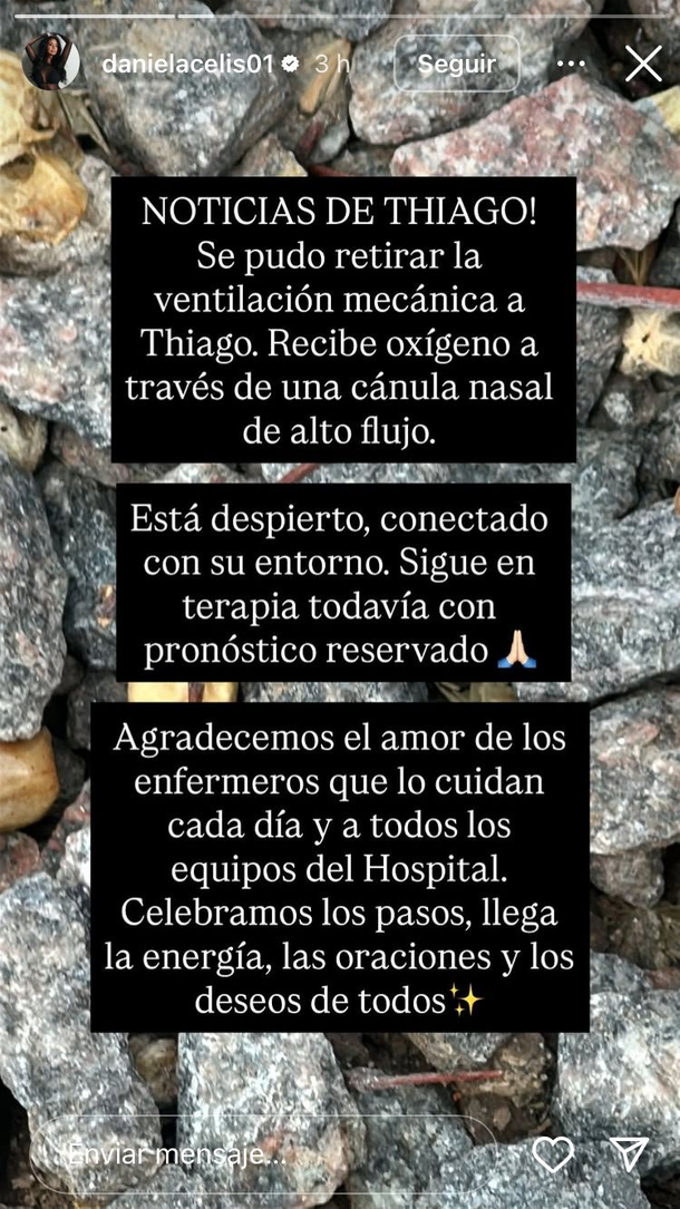 La influencer utilizó sus redes sociales para detallar los avances médicos de Thiago. “Noticias de Thiago. Se pudo retirar la ventilación mecánica a Thiago. Recibe oxígeno a través de una cánula nasal de alto flujo. Está despierto, conectado con su entorno. Sigue en terapia todavía con pronóstico reservado”, anunció Celis.