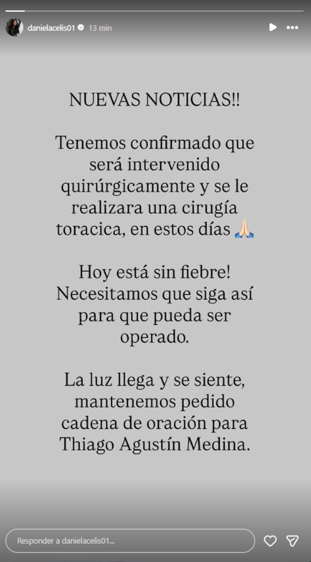 “Nuevas noticias. Tenemos confirmado que será intervenido quirúrgicamente y se le realizará una cirugía torácica, en estos días”, comenzó diciendo Celis, y añadió: “Hoy está sin fiebre. Necesitamos que siga así para que pueda ser operado". Al cierre de su mensaje, volvió a hacer un pedido habitual tanto de su parte como del entorno de Medina: “La luz llega y se siente, mantenemos la solicitud de la cadena de oración para Thiago”.