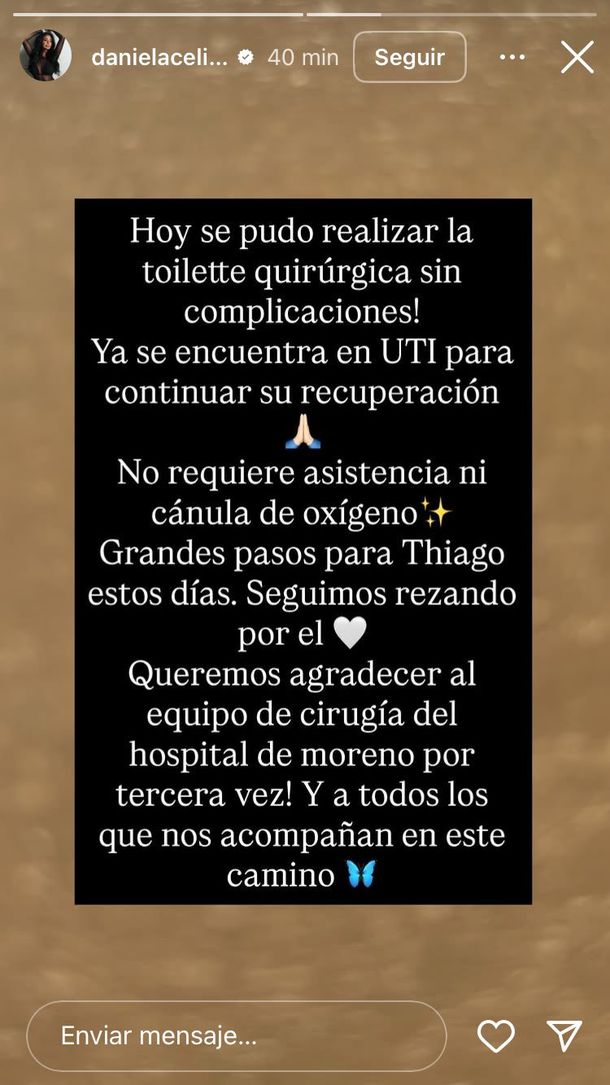 En este sentido, Daniela Celis ya había adelantado este miércoles que al joven le tenían que realizar un procedimiento médico este jueves. Tras llevarse a cabo el mismo, la exparticipante de Gran Hermano informó lo siguiente en redes sociales: "¡Hoy se pudo realizar la toilette quirúrgica sin complicaciones! Ya se encuentra en UTI para continuar su recuperación. No requiere asistencia ni cánula de oxígeno", comenzó indicando.