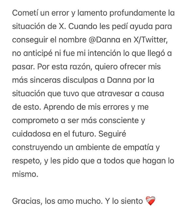 "Cometí un error y lamento profundamente la situación de X (ex Twitter). Cuando les pedí ayuda para conseguir el nombre @Danna, no anticipé ni fue mi intención lo que llegó a pasar. Por esta razón, quiero ofrecer mis sinceras disculpas a Danna por la situación que tuvo que atravesar a causa de esto", señaló.