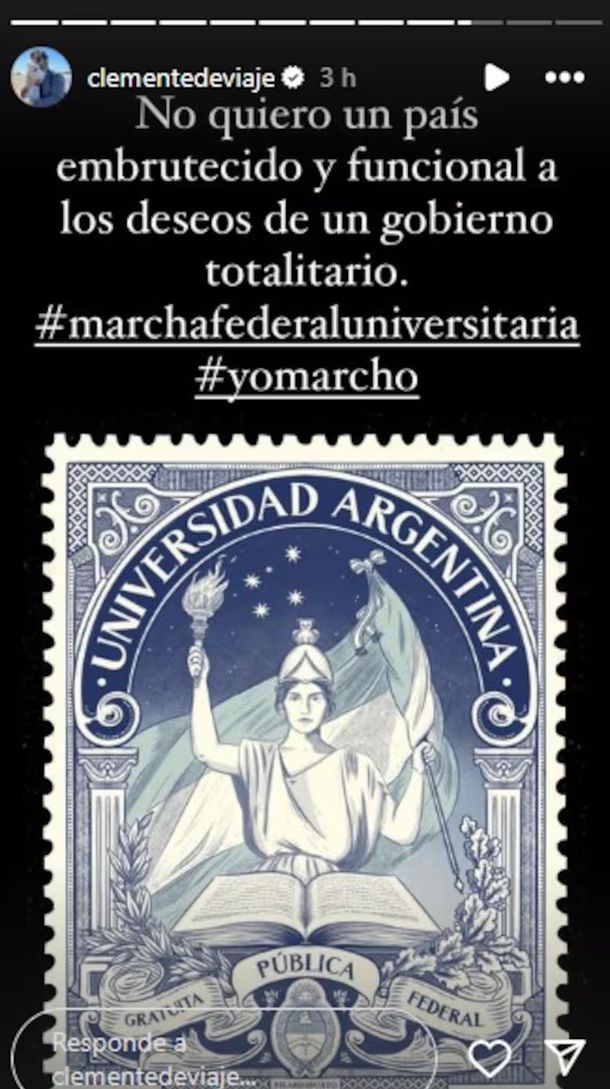 Clemente Canela, periodista de Urbana Play, señaló: “No quiero un país embrutecido y funcional a los deseos de un gobierno totalitario #marchafederaluniversitaria #yomarcho”, con la misma imagen viral que el resto de los comentarios.