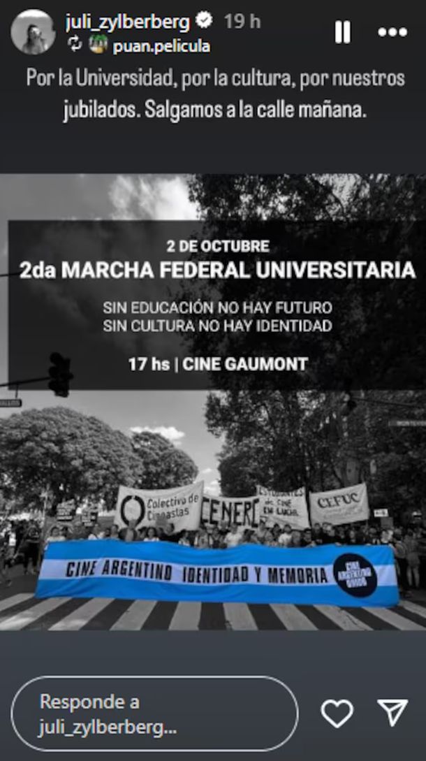 Julieta Zylberberg, por su parte, hizo un posteo en el que no solamente reclamó por la educación universitaria, sino que además pidió un aumento salarial a los jubilados y pensionados nacionales. Ella replicó un mensaje de la organización del cine argentino. “Por la universidad, por la cultura, por nuestros jubilados. Salgamos a la calle mañana”, escribió Julieta.