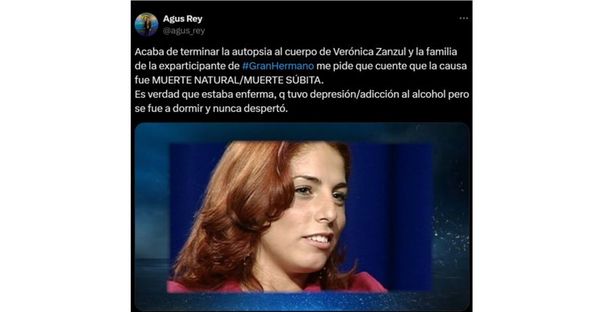 Luego de diversas especulaciones sobre la posible decisión de la exconcursante del reality show de quitarse la vida, el periodista Agustín Rey ofreció detalles en su cuenta de X (ex Twitter), aclarando finalmente lo sucedido. "Acaba de terminar la autopsia al cuerpo de Verónica Zanzul y la familia de la exparticipante de #GranHermano me pide que cuente que la causa fue MUERTE NATURAL / MUERTE SÚBITA", explicó Rey.