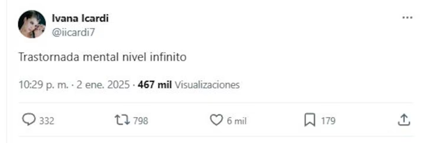 “Trastornada mental nivel infinito”, escribió la ex Gran Hermano, dejando en evidencia su postura frente al conflicto familiar. La relación entre Ivana y Wanda ha estado marcada por años de conflictos y enfrentamientos públicos, por lo que no sorprende que la hermana de Mauro haya tomado partido.