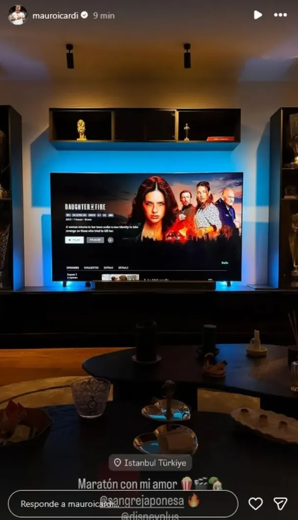 En la historia, Icardi acompañó la fotografía con la frase “Maratón con mi amor”, sumando una serie de emoticones que funcionaron como un guiño directo a la situación. Entre pochoclos, una claqueta de cine y una pequeña casita que sugería un plan íntimo y tranquilo, dejó entrever que la noche tendría un rumbo definido. Además, agregó el nombre de su pareja coronado por un emoji de fuego, un detalle que conectó tanto con el título de la serie como con la complicidad que suele mostrar la pareja.