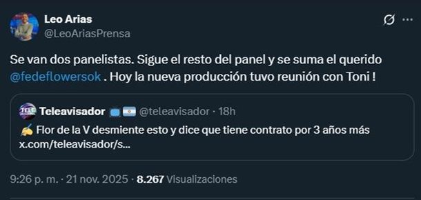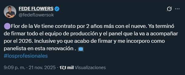 Una de las novedades más destacadas llegó de la mano de Fede Flowers, quien decidió compartir con sus seguidores que se suma de forma oficial al ciclo. En su mensaje en redes, confirmó: "Flor de la V tiene contrato por dos años más con El Nueve. Ya terminó de firmar todo el equipo de producción y el panel que la va a acompañar por el 2026. Inclusive yo, que acabo de firmar y me incorporo como panelista en esta renovación".