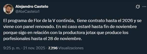 Mientras tanto, no todos celebran. El excronista de LAM, Alejandro Castelo, comunicó que dejará su lugar en el panel a fines de noviembre, ya que su vínculo con la productora Jotax —responsable del ciclo hasta este año— vence el día 28. Cabe destacar que, desde diciembre, la realización pasará a manos directas del canal, prescindiendo de la productora externa.