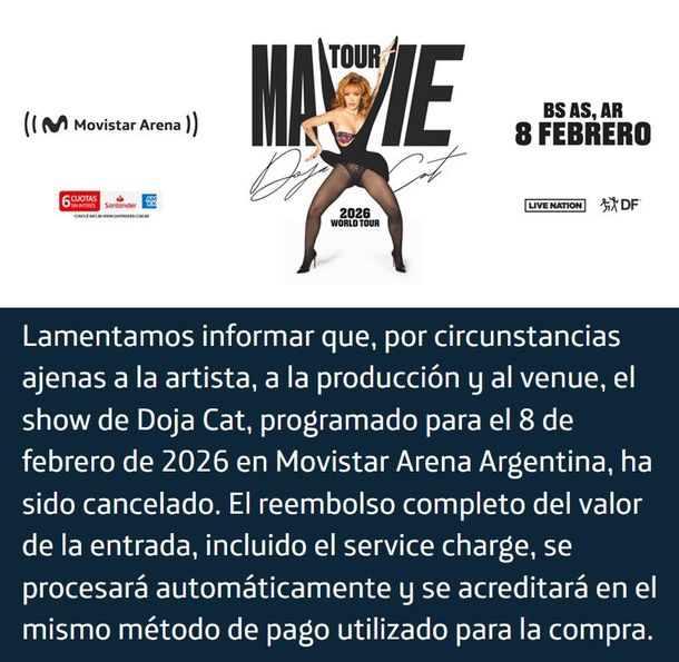 “Lamentamos informar que, por circunstancias ajenas a la artista, a la producción y al venue, el show de Doja Cat, programado para el 8 de febrero de 2026 en el Movistar Arena Argentina, ha sido cancelado. El reembolso completo del valor de la entrada, incluido el service charge, se procesará automáticamente y se acreditará en el mismo método de pago utilizado para la compra”, señala el mensaje difundido por los organizadores, que no brindaron mayores detalles sobre los motivos que derivaron en la decisión. La aclaración apunta a desligar de responsabilidades tanto a la cantante como a la productora local y al estadio, lo que abre la puerta a posibles cuestiones logísticas, contractuales o de agenda internacional.