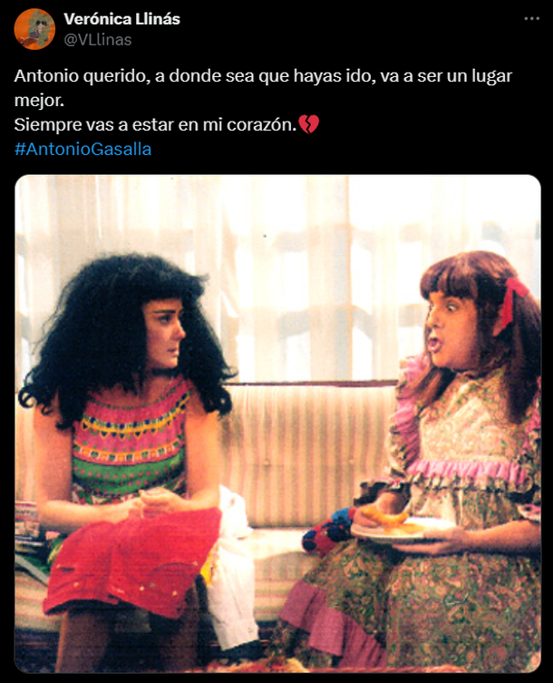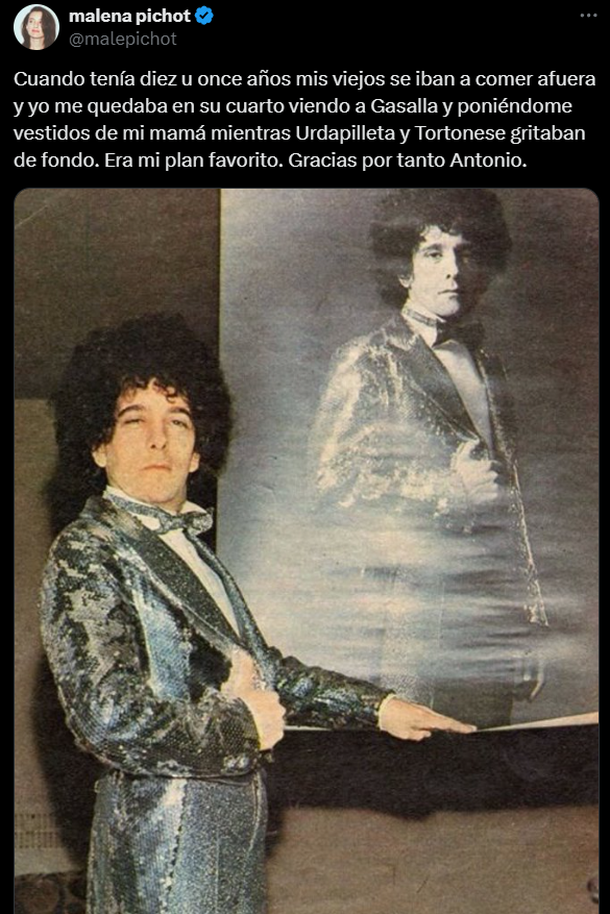 “Cuando tenía diez u once años, mis viejos se iban a comer afuera y yo me quedaba en su cuarto viendo a Gasalla y poniéndome vestidos de mi mamá mientras Urdapilleta y Tortonese gritaban de fondo. Era mi plan favorito. Gracias por tanto, Antonio”, escribió Malena Pichot, actriz y comediante