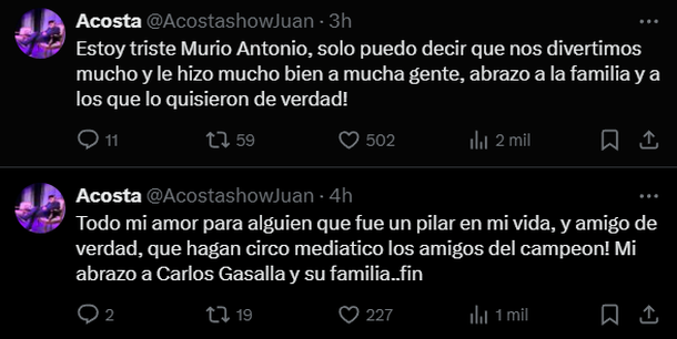 Juan Acosta, quien trabajó en varios proyectos con Antonio, lo despidió con una foto vintage en su cuenta de Instagram y escribió: “Chau, querido amigo”. Minutos antes, había dejado un mensaje en su cuenta de X en el que se explayó un poco más: “Estoy triste. Murió Antonio, solo puedo decir que nos divertimos mucho y que le hizo mucho bien a mucha gente. Abrazo a la familia y a los que lo quisieron de verdad”.
