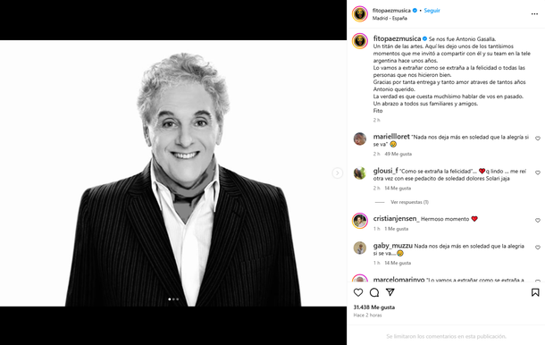 Fito Páez fue uno de los primeros en homenajearlo y usó su cuenta de Instagram para despedirlo con un sentido mensaje: “Se nos fue Antonio Gasalla. Un titán de las artes. Aquí les dejo uno de los tantísimos momentos que me invitó a compartir con él y su team en la tele argentina hace unos años. Lo vamos a extrañar como se extraña a la felicidad o a todas las personas que nos hicieron bien”.