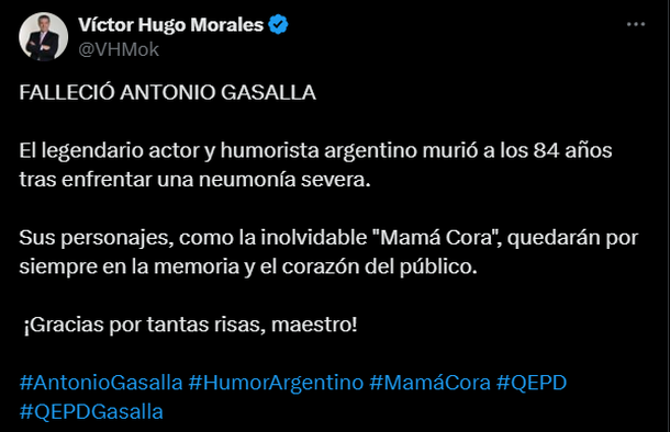 Víctor Hugo Morales también recordó su legado y le agradeció por su talento: “Sus personajes, como la inolvidable Mamá Cora, quedarán por siempre en la memoria y el corazón del público. ¡Gracias por tantas risas, maestro!”.