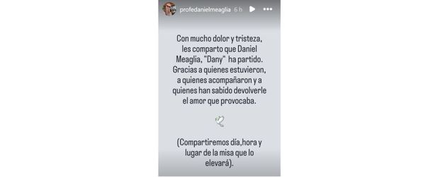 "Con mucho dolor les comparto que Daniel Meaglia, 'Dany', ha partido. Gracias a quienes estuvieron, a quienes acompañaron y a quienes han sabido devolverle el amor que provocaba", expresaron desde su cuenta oficial, visiblemente afectados por la pérdida.