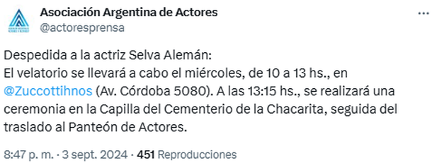 Además, la institución reveló los datos para el último adiós de la actriz: "El velatorio se llevará a cabo el miércoles, de 10 a 13 hs, en @Zuccottihnos (Av. Córdoba 5080). A las 13:15 hs, se realizará una ceremonia en la Capilla del Cementerio de la Chacarita, seguida del traslado al Panteón de Actores".
