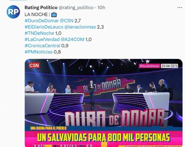 El programa conducido por Pablo Duggan alcanzó este martes los 2.8 puntos de rating y lideró los canales de noticias. Detrás lo siguieron el El diario de Leuco, emitido por la señal de noticias de La Nación, con 2.3 puntos, y TN de noche, con 1 punto.