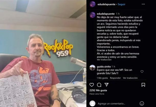 Por otro lado, al rato de esta publicación, De la Puente compartió un nuevo mensaje con una fotografía suya: “No deja de ser muy fuerte saber que, al momento de esta foto, estaba sufriendo un ACV”, dijo el conductor mientras se mostraba en su puesto en la Rock&Pop dejando así en claro que el ACV se dio en la radio.