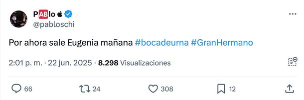 "Por ahora sale Eugenia mañana #bocadeurna #GranHermano", escribió el tuitero. De concretarse, Luz, Ulises y Santiago quedarían como los grandes finalistas.