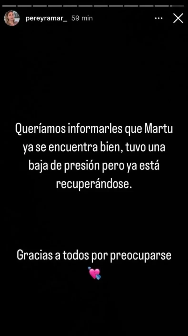 “Queríamos informarles que Martu ya se encuentra bien. Tuvo una baja de presión, pero ya está recuperándose. Gracias a todos por preocuparse”, sostuvieron desde el entorno más cercano de la joven.