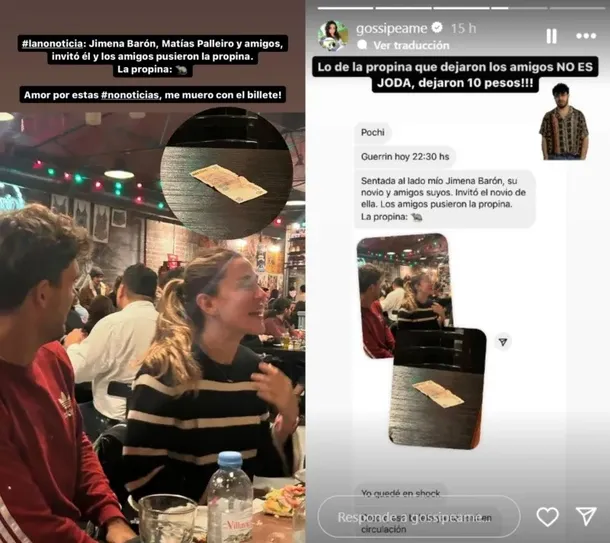 Según la mujer, el grupo dejó un billete de diez pesos como propina, que fue retratado en la imagen que Pochi compartió. “Jimena Barón, Matías Palleiro y amigos, invitó él y los amigos pusieron la propina”, escribió la Instagramer junto a un emoji de una rata.