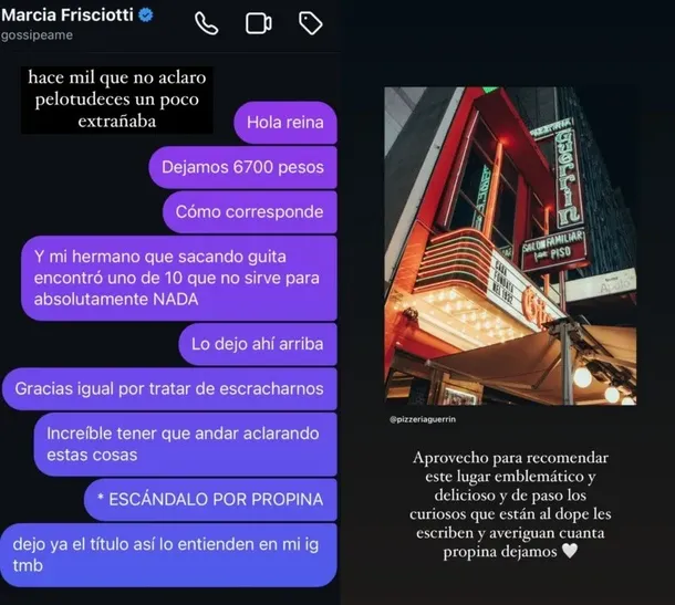 La actriz compartió, además, una historia arrobando a la pizzería Guerrín: “Aprovecho también para recomendar este lugar emblemático y de paso los curiosos que están al dope le escriben y averiguan cuanta propina dejamos”.