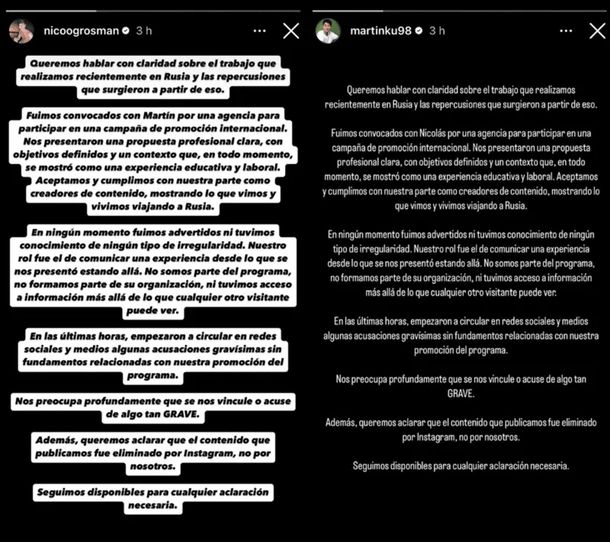 A través de su descargo, los influencers intentaron despegarse de cualquier responsabilidad: “Aceptamos y cumplimos con nuestra parte como creadores de contenido, mostrando lo que vimos y vivimos viajando a Rusia. En ningún momento fuimos advertidos ni tuvimos conocimiento de ningún tipo de irregularidad”, afirmaron.