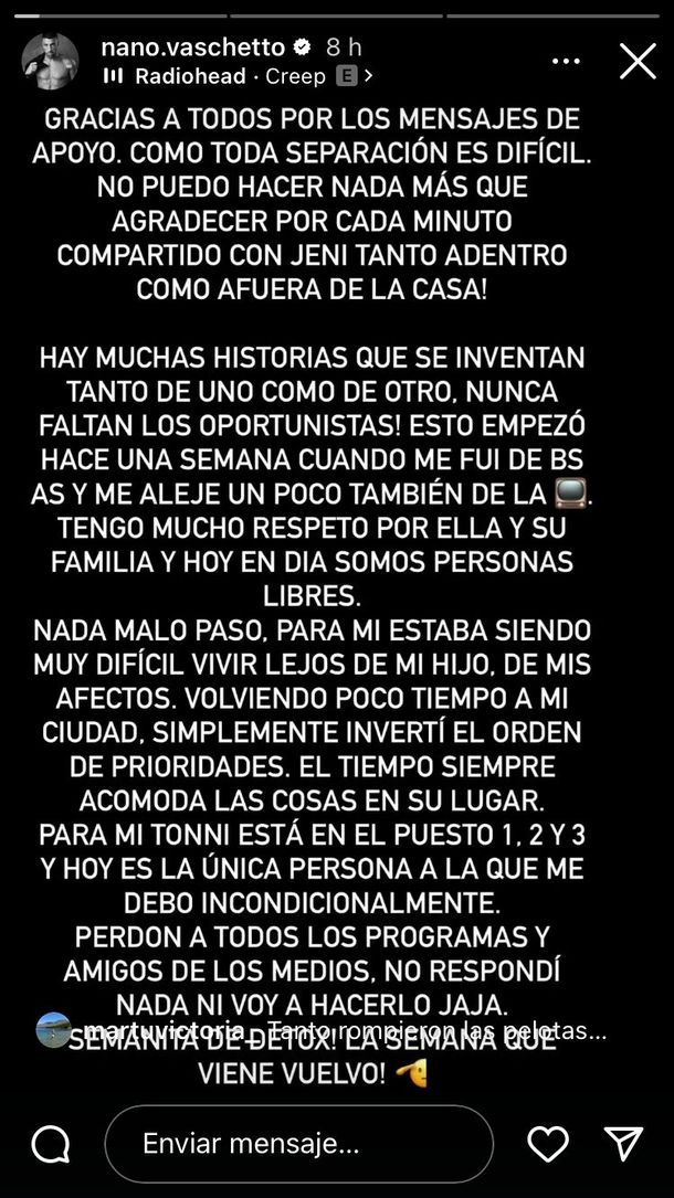 Y agregó: "Con Nano ya no estamos juntos. Él decidió tomar otro camino, y aunque fue difícil al principio, entiendo que así tenía que ser", escribió, dando a entender que la iniciativa para separarse fue enteramente del santafesino.