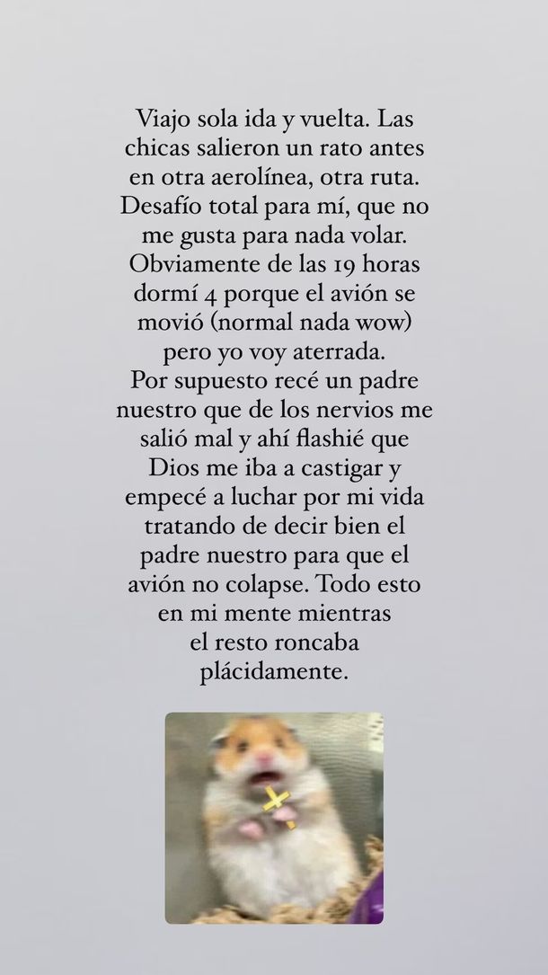 “Por supuesto, recé un Padre Nuestro que de los nervios me salió mal. Ahí me imaginé que Dios me iba a castigar y empecé a luchar por mi vida tratando de decirlo bien para que el avión no colapse. Todo esto en mi mente mientras el resto roncaba plácidamente”, continuó la compositora.
